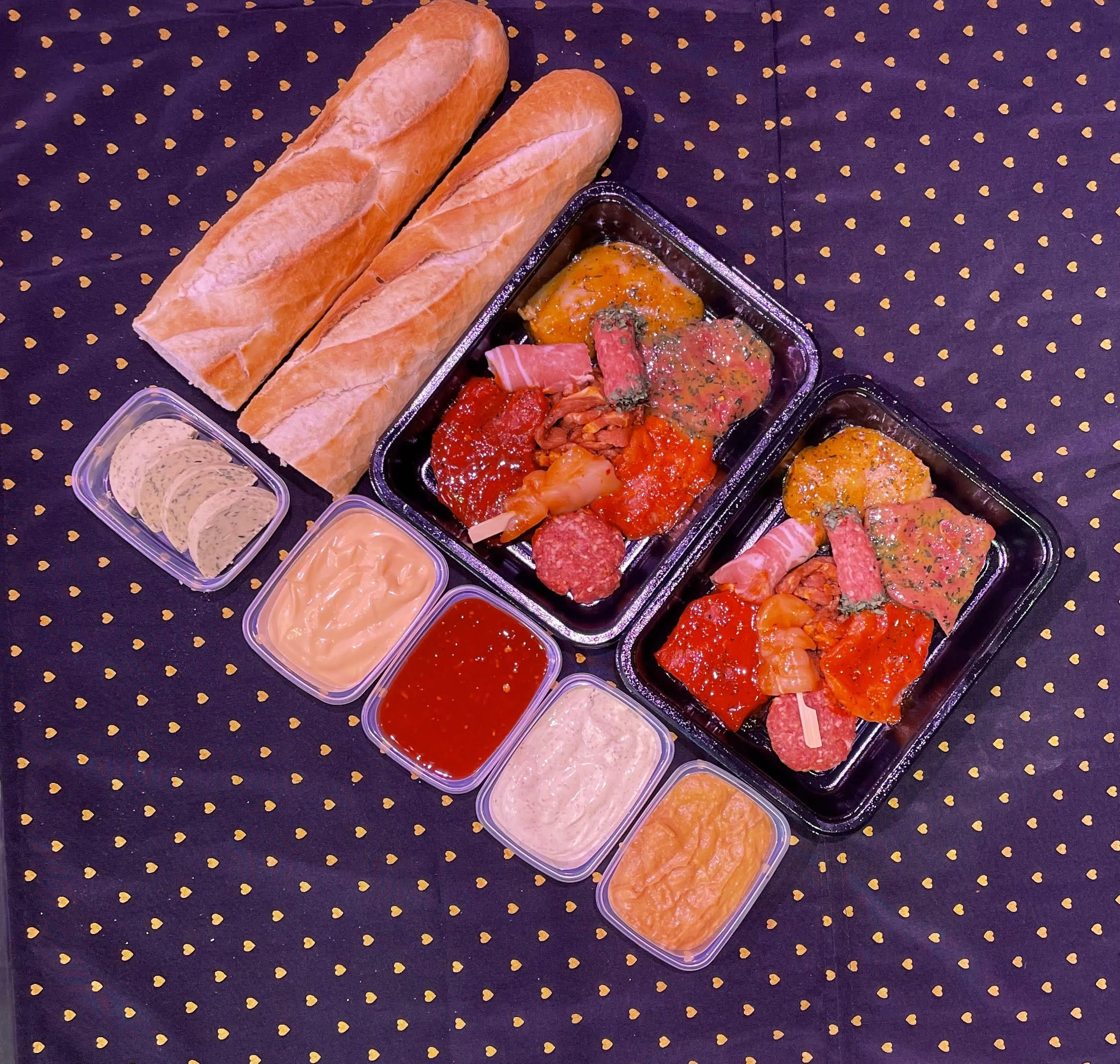 9 soorten vlees, sauzen, stokbrood met kruidenboter,